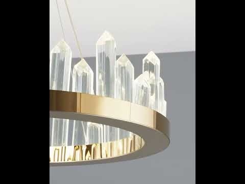 Подвесная люстра Ingrid в стиле модерн. Круглый металлический каркас диаметром 40 см украшен прозрачными вставками из хрусталя в виде кристаллов, которые создают изумительную игру света при освещении. В качестве источника света служит LED лента общей мощностью 25 Вт и со световым потоком 1800 Лм. Площадь освещения составляет 18 м², высоту люстры при необходимости можно уменьшить при монтаже с помощью подвесных тросов. Лаконичный дизайн люстры впишется в любой интерьер зала, спальни, кухни или холла.
