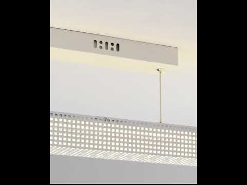 Подвесной линейный светильник в классическом стиле. Прямоугольный плафон белого цвета оснащен металлической сеткой, которая мягко рассеивает свет для создания комфортного освещения. В качестве источника света служат встроенные светодиоды мощностью 25 Вт и со световым потоком 1500 Лм. Максимальная высота светильника составляет 120 см, при необходимости ее можно отрегулировать за счет подвесных тросов. Данная модель светильника идеально подойдет для освещения барной или обеденной зоны не только в доме, но в ресторанах и кафе.