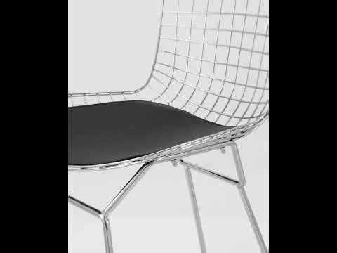 Спинка и сидение выполнены из металлических прутьев в виде сетки и образуют единое целое. Подушка изготовлена из экокожи в черном цвете. Ножки выполнены из металла.