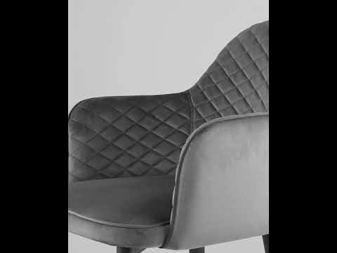 Мягкий стул с округлой спинкой анатомической формы и удобными подлокотниками подарит комфорт и уют. В качестве обивки используется велюр - прочный износостойкий материал. Внутренняя сторона спинки и подлокотников украшена декором в виде ромбов. Высота подлокотников от пола - 64,5 см. Прямые металлические ножки в черном цвете имеют нестандартную форму в виде перевернутого конуса, поэтому обеспечивают хорошую устойчивость и делают стул оригинальным. Специальные подпятники на ножках защищают напольное покрытие от повреждений и предотвращают скольжение. Изделие будет прекрасно смотреться как отдельный предмет мебели, так и в комплекте с обеденным столом.